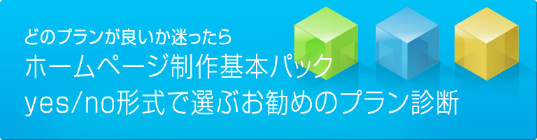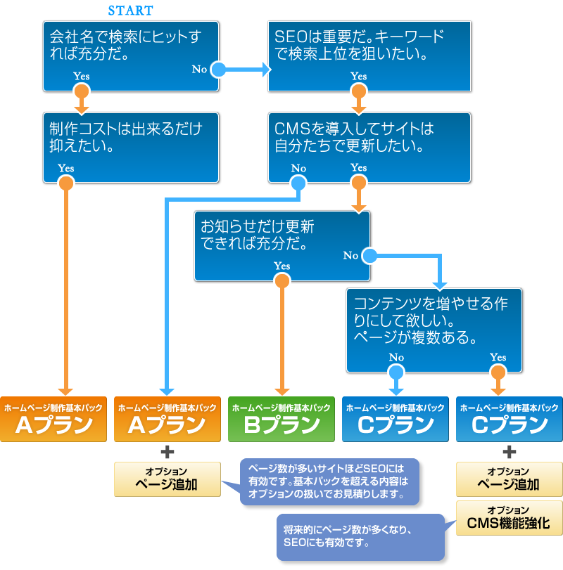 ホーム > yes/no形式で選ぶお勧めのプラン診断 当事務所のホームページ制作基本パック、どのプランが良いかyes/no形式で選べるイメージをご用意しました。プラン選択の検討にご利用ください。それでは始めましょう。 いかがでしょうか。用途に合わせてプラン選択の参考になれば幸いです。よくわからない、もっと聞いてみたい、確認したい等ございましたら下記までお気軽にお問い合わせください。 お問い合わせはこちら